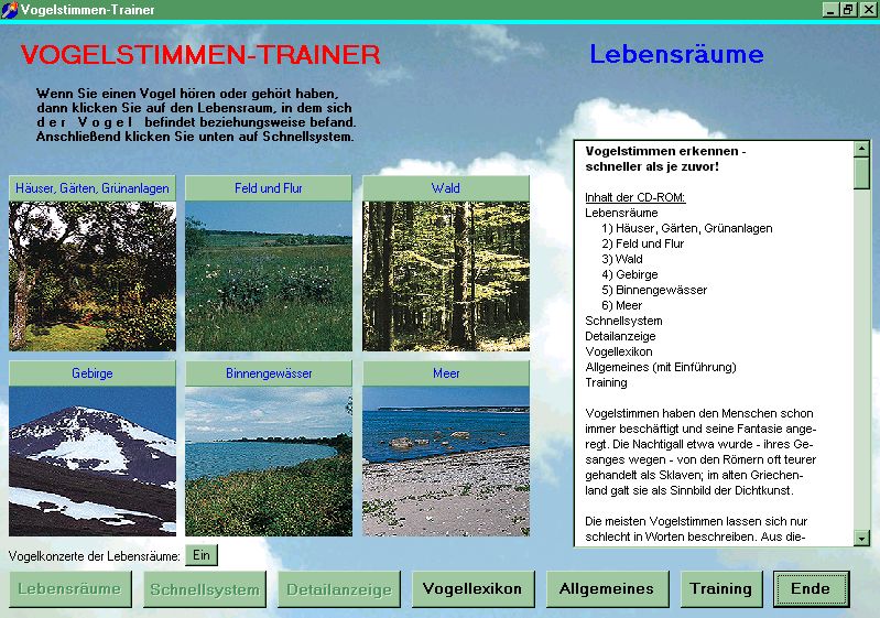- Diese CD-ROM verfolgt zwei Hauptziele: die schnelle Bestimmung von Vogelstimmen und das Trainieren von Vogelstimmen.